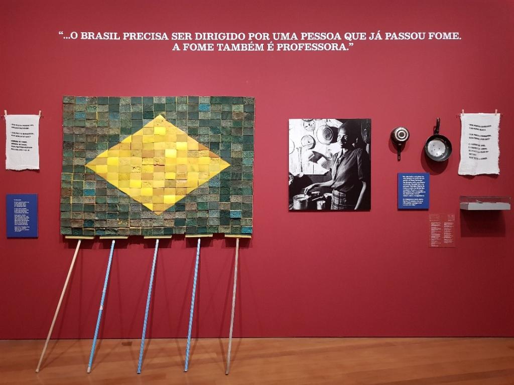 Fotografia da exposição “Carolina Maria de Jesus – Um Brasil para os Brasileiros”, no Instituto Moreira Salles, em que é possível verificar aspectos da estética periférica, como o mapa do Brasil feito de esponjas de lavar louça. É possível visualizar, também, uma imagem de Carolina de Jesus, uma frigideira e a frase, de sua autoria, “... O Brasil precisa ser dirigido por uma pessoa que já passou fome. A fome também é professora.”