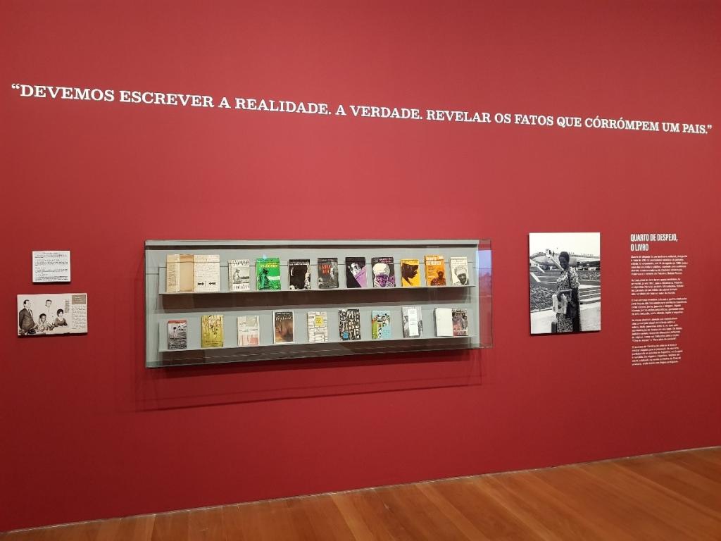 Fotografia da exposição “Carolina Maria de Jesus – Um Brasil para os Brasileiros”, no Instituto Moreira Salles. É possível ler a frase “Devemos escrever a realidade, a verdade, revelar os fatos que corrompem um país.” Abaixo da frase há edições de “Quarto de despejo” traduzidas para diversos idiomas.