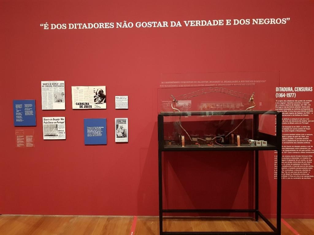 Fotografia da exposição, com destaque para a frase “É dos ditadores não gostar da verdade e dos negros” e imagens de Carolina em jornais.