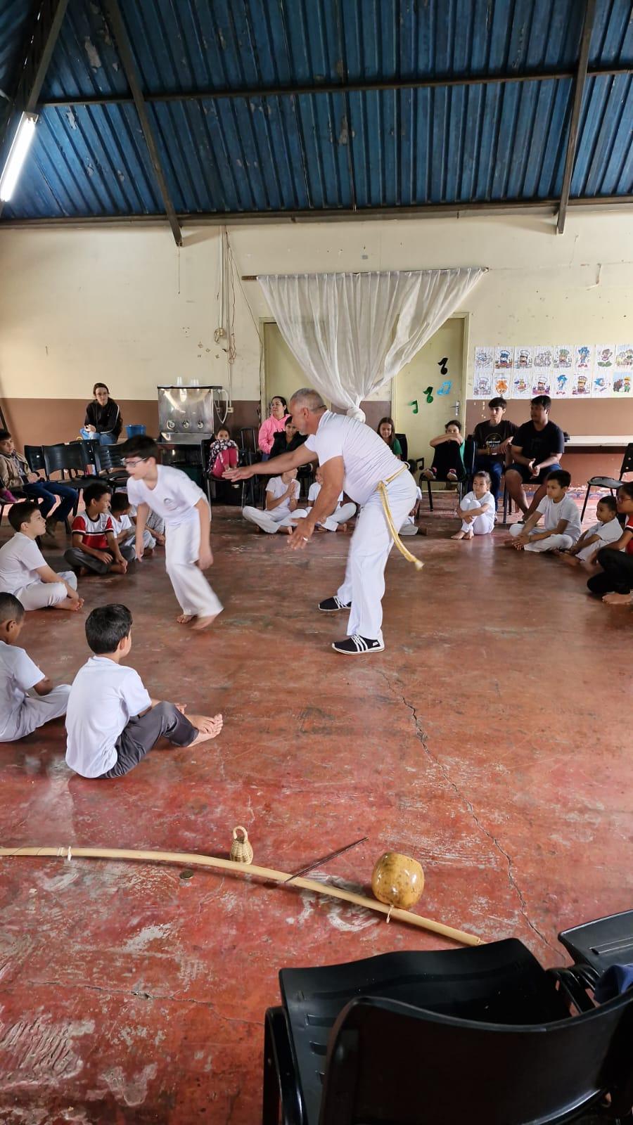 Para integrar esta reflexão de forma pedagógica e cultural, o evento contou com apresentações de Capoeira ministradas pelo Professor Hélio Silva. A Capoeira, reconhecida como uma das maiores expressões culturais afro-brasileiras, mistura movimentos de arte marcial, dança e música, carregando em sua formação a identidade e a resistência do povo negro desde os tempos de escravidão.