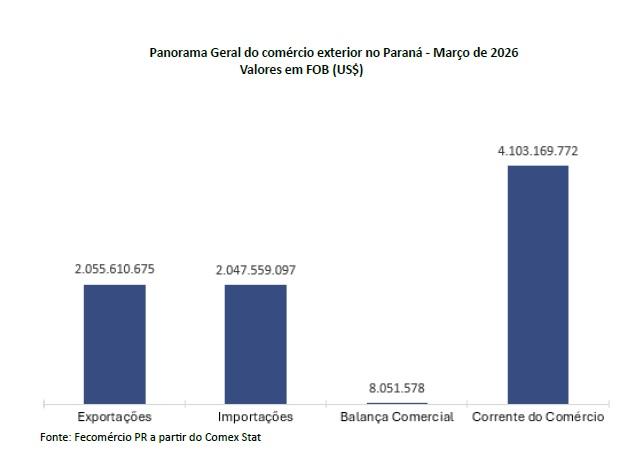 A balança comercial do Paraná registrou superávit de US$ 8,1 milhões em março de 2026, com corrente de comércio de US$ 4,1 bilhões, segundo análise da Federação do Comércio de Bens, Serviços e Turismo do Paraná (Fecomércio PR) com base em dados oficiais de comércio exterior. No mês, o destaque ficou para o avanço das importações de veículos elétricos, que refletem uma mudança relevante no padrão de consumo e na dinâmica do setor automotivo.