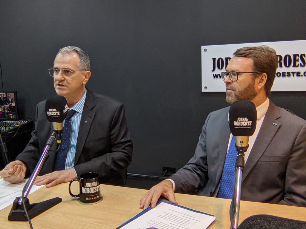 O Delegado da Receita Federal em Maringá, Marcos Wanderley de Souza, e o Analista Tributário Marcos Luchiancenkol estiveram no estúdio do Jornal Noroeste para uma entrevista que vai ao ar na próxima semana. Na conversa, eles abordam temas como combate à sonegação, arrecadação e cidadania fiscal - Foto Alex Fernandes França