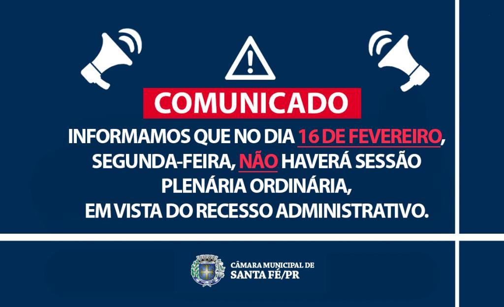 A Câmara Municipal de Santa Fé comunicou oficialmente que não realizará a Sessão Ordinária prevista para a próxima segunda-feira, dia 16 de fevereiro. A suspensão ocorre em virtude do recesso administrativo de Carnaval.
