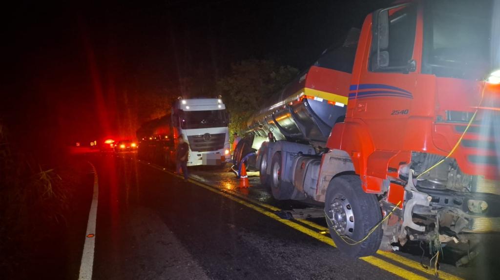O veículo acabou colidindo contra a defensa metálica (guard-rail) situada à margem esquerda da rodovia, considerando o sentido de tráfego. Na sequência, o conjunto ficou imobilizado parcialmente sobre a pista, obstruindo uma das faixas e apresentando risco de tombamento, além da possibilidade de derramamento da carga inflamável, o que poderia atingir o curso d’água e causar danos ambientais.