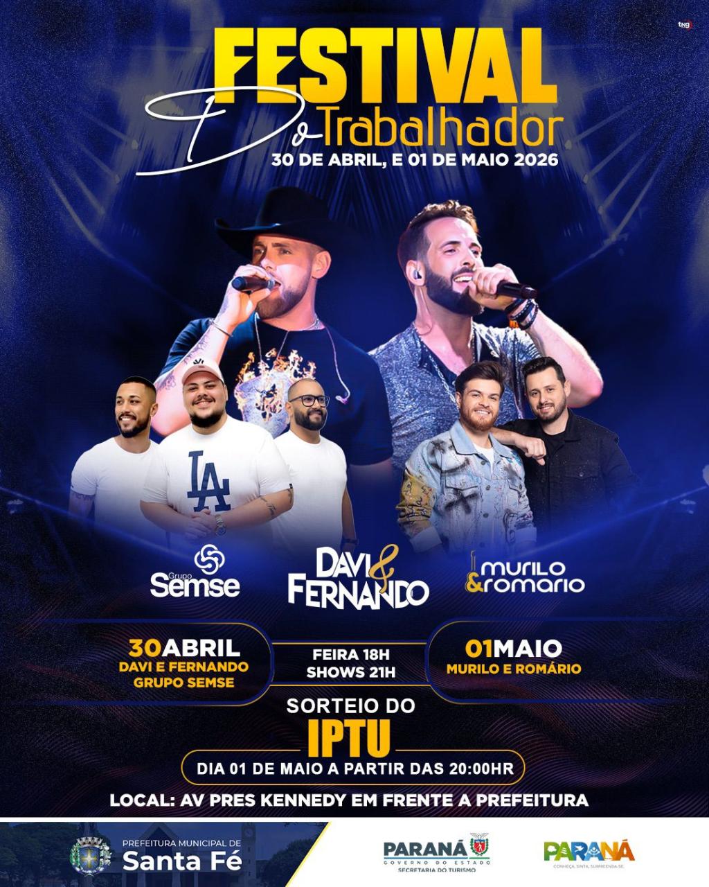 Arte oficial do Festival do Trabalhador, promovido pela Prefeitura de Santa Fé, destaca a programação desta quinta (30) e sexta-feira (01), com shows de Davi & Fernando, Grupo Semse e Murilo & Romário, além da Feira do Empreendedor e sorteio do IPTU