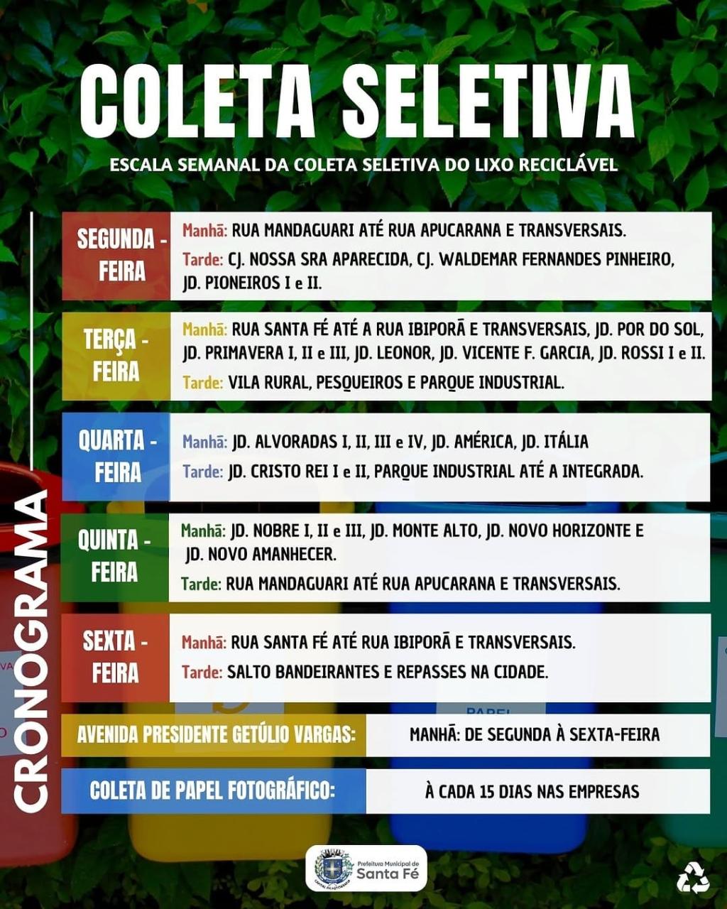 Prefeitura de Santa Fé divulga escala semanal da Coleta Seletiva