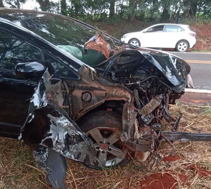 Veículo Honda Civic ficou bastante danificado após sair da pista e colidir contra árvores às margens da PR-317, em Santa Fé - (Foto divulgação/PRE)