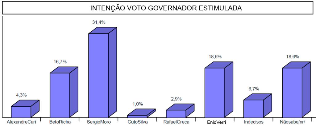 No cenário estimulado para o Governo do Estado, o ex-juiz e senador Sergio Moro lidera com 31,4% das intenções de voto, seguido por Ênio Verri (PT), com 18,6%, e pelo ex-governador Beto Richa, que registra 16,7%. Alexandre Curi aparece com 4,3%, Rafael Greca com 2,9% e Guto Silva com 1,0%. O levantamento aponta ainda um contingente relevante de eleitores que não souberam ou não responderam (18,6%), além de 6,7% de indecisos, indicando um cenário ainda em consolidação no âmbito estadual.
