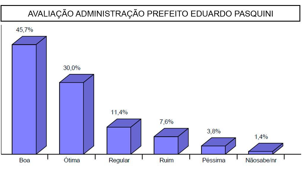 Além da pergunta direta sobre aprovação ou reprovação, os entrevistados também avaliaram a administração municipal em diferentes graus. Somando-se os conceitos “ótima” (30,0%) e “boa” (45,7%), a gestão Pasquini alcança 75,7% de avaliações positivas. A classificação “regular” foi atribuída por 11,4%, enquanto “ruim” e “péssima” somam 11,4%.