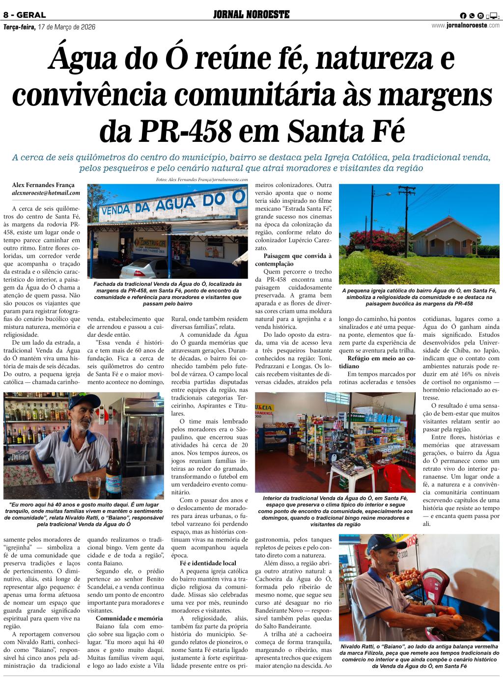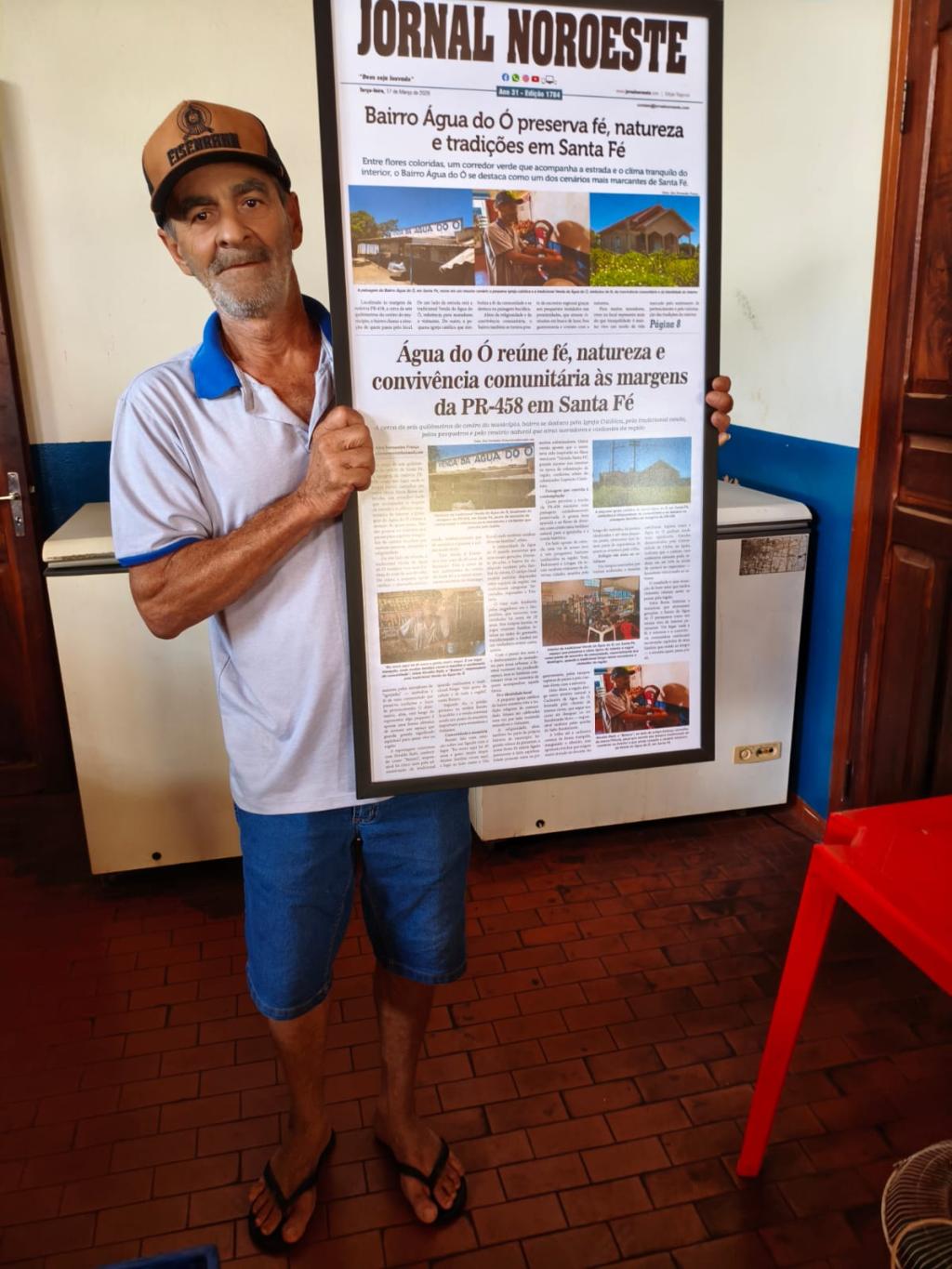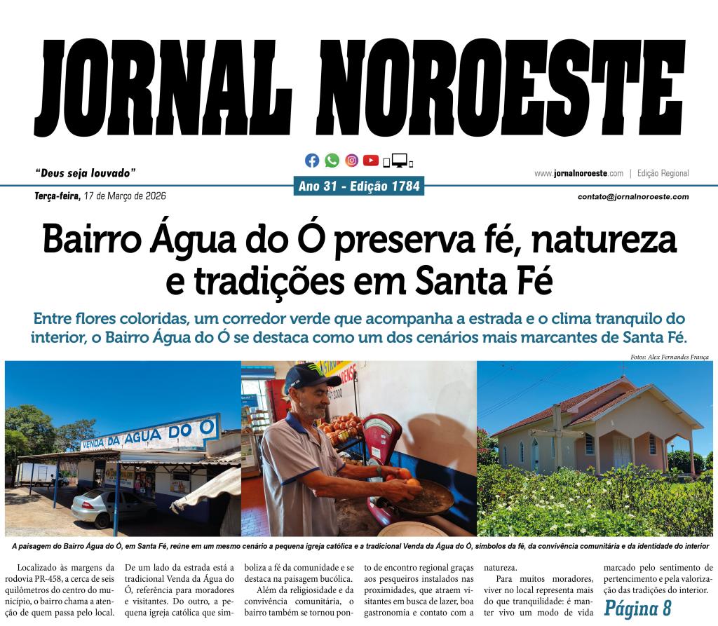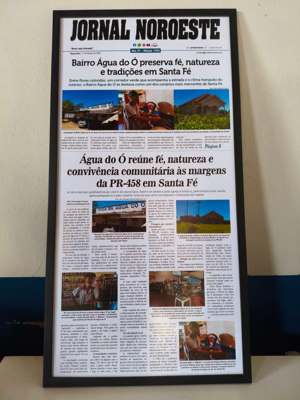 Publicada na edição de 17 de março de 2026, a reportagem especial sobre a Água do Ó destacou a força da fé, da natureza e da convivência comunitária às margens da PR-458, em Santa Fé. Veiculada tanto no jornal impresso quanto na versão digital, a matéria ganhou ampla repercussão e, agora, tem sua história eternizada em quadro exposto na tradicional Venda da Água do Ó, reforçando o valor da memória e da identidade local