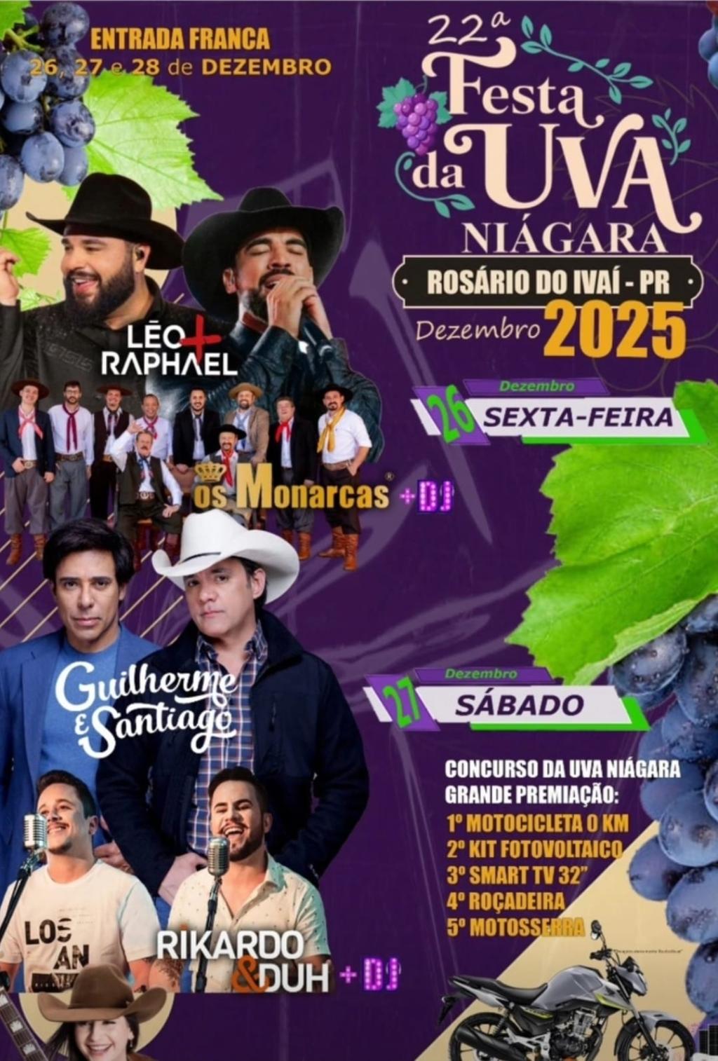 O Município de Rosário do Ivaí, localizado a cerca de 218 quilômetros de Nova Esperança, realiza entre os dias 26, 27 e 28 de dezembro a 22ª edição da tradicional Festa da Uva Niágara. O evento, que já faz parte do calendário cultural e turístico da cidade, terá entrada franca e promete atrair moradores e visitantes de toda a região.