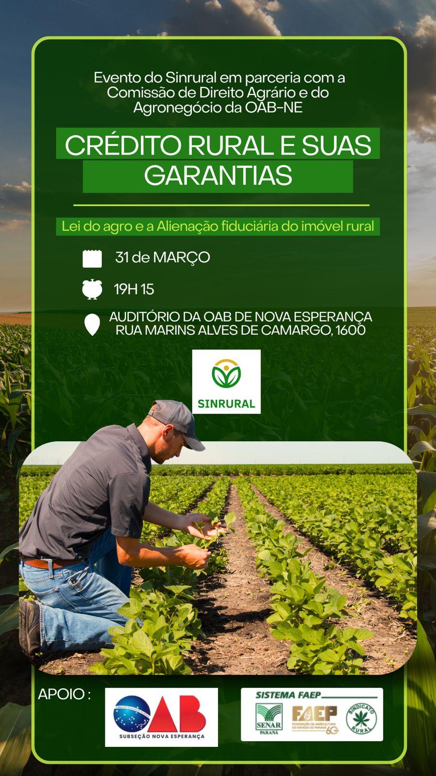 O Sindicato Rural de Nova Esperança (Sinrural), em parceria com a Comissão de Direito Agrário e do Agronegócio da OAB local, promove na próxima terça-feira, dia 31 de março, um importante evento voltado ao setor agropecuário. Com o tema “Crédito Rural e suas Garantias”, o encontro terá início às 19h15, no auditório da OAB de Nova Esperança, localizado na Rua Marins Alves de Camargo, 1600.