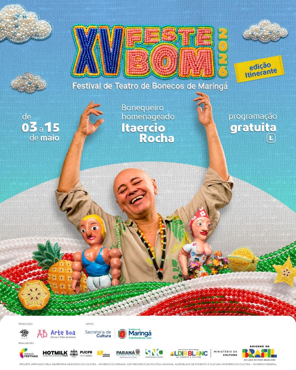 O XV FESTEBOM – Festival de Teatro de Bonecos de Maringá acontece entre os dias 03 e 15 de maio de 2026, consolidando-se como um dos principais eventos dedicados ao teatro de animação no Paraná e no Brasil. Esta é a segunda edição em formato itinerante, ampliando o alcance do festival para além de Maringá, com programação também nas cidades de Guaraci, Marialva, Apucarana, Itambé, Sarandi, Floresta, Mandaguaçu e Lobato.