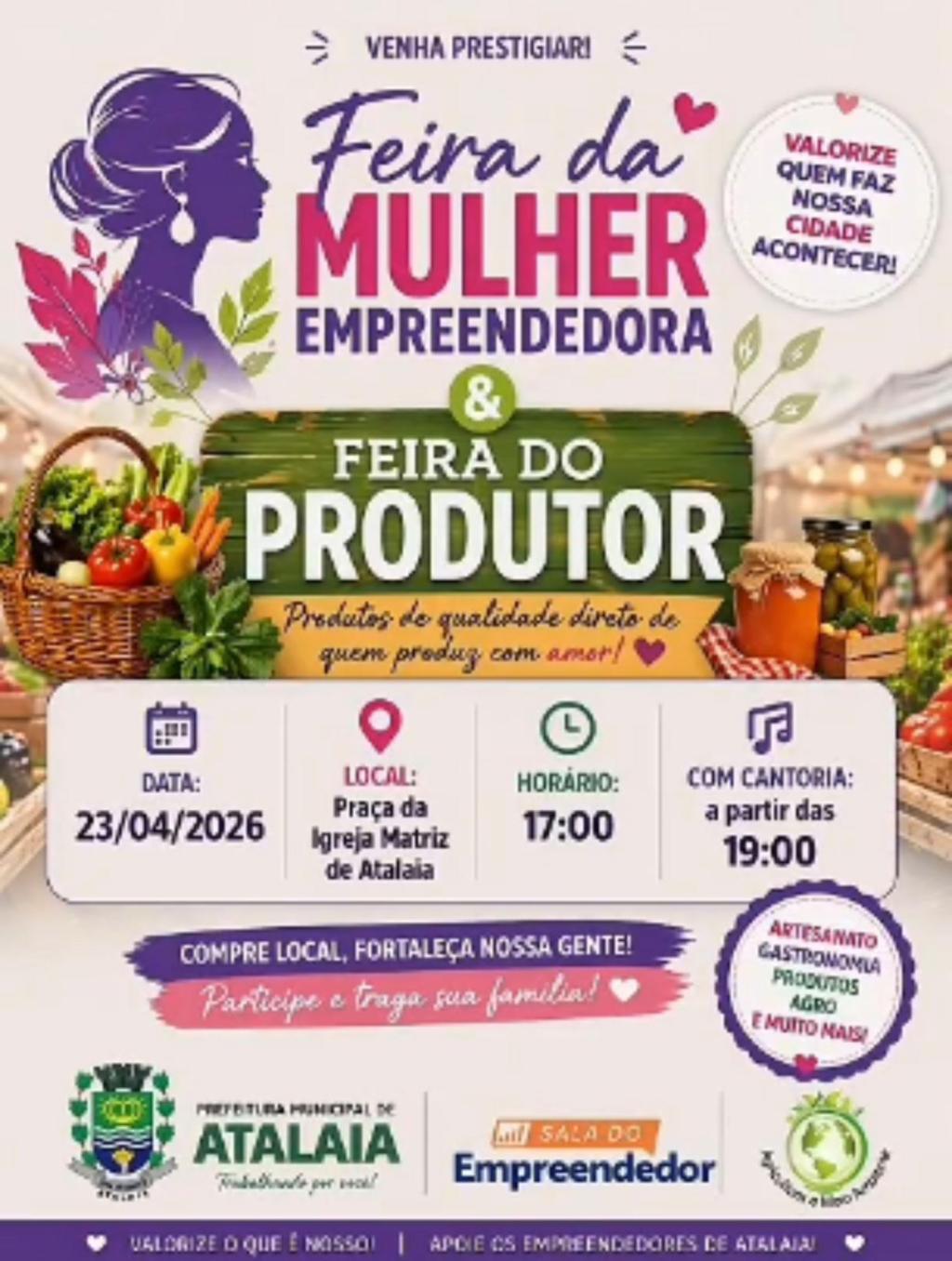 A cidade de Atalaia recebe nesta quinta-feira, 23 de abril, mais uma edição da Feira da Mulher Empreendedora & Feira do Produtor, evento que promete reunir a comunidade em torno da valorização do comércio local, do empreendedorismo feminino e da produção artesanal e agrícola do município.