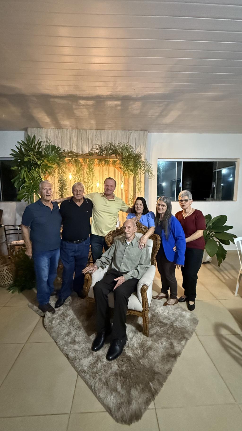 Ao comemorar 99 anos de vida, José Ciorlin posa ao lado dos filhos, celebrando não apenas o tempo vivido, mas a força de uma família construída com trabalho e amor