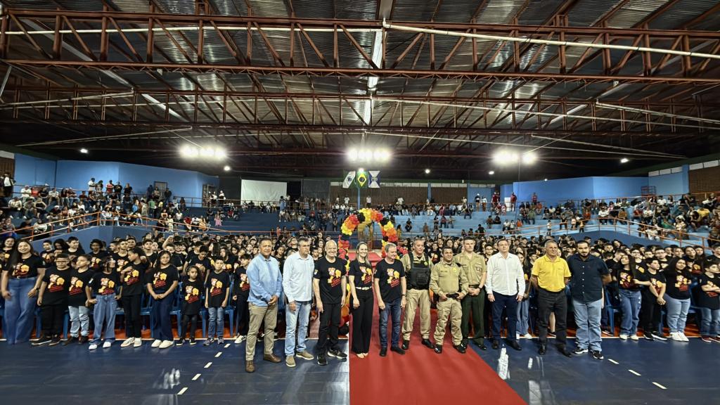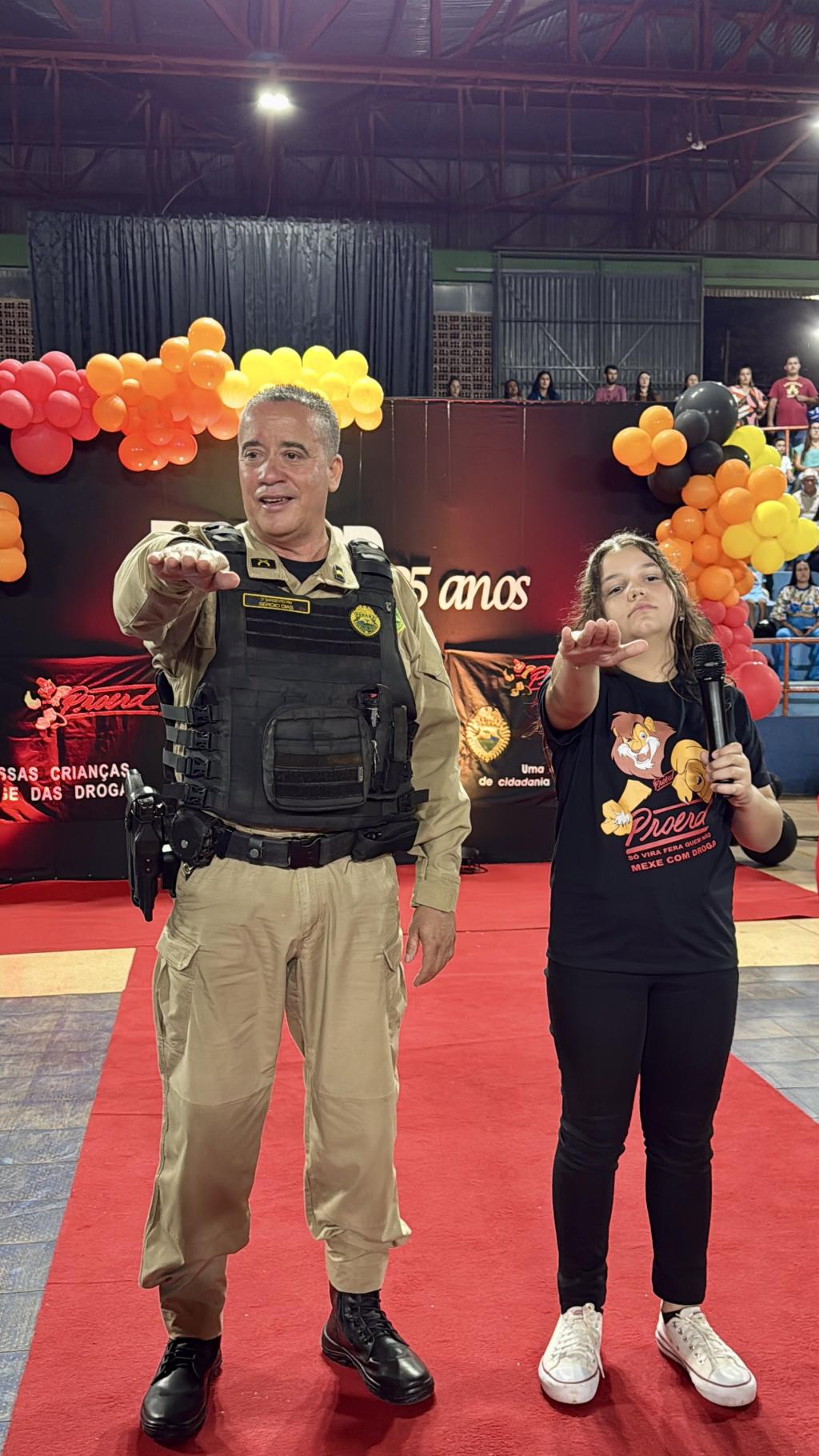 Um dos momentos mais emocionantes foi o juramento coletivo, conduzido pela aluna Emanuely Vitória Alves Fardin, do 5º ano B da Escola Tancredo Neves, junto ao instrutor Sargento Sérgio Dias. Os alunos prometeram diante das autoridades, professores e pais “ficar sempre longe das drogas e da violência”.