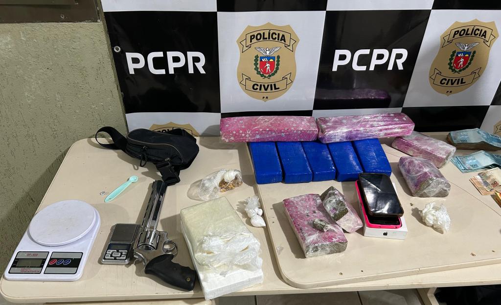 Drogas, arma de fogo e dinheiro foram apreendidos durante operação da Polícia Civil no Centro - (Foto PCPR)